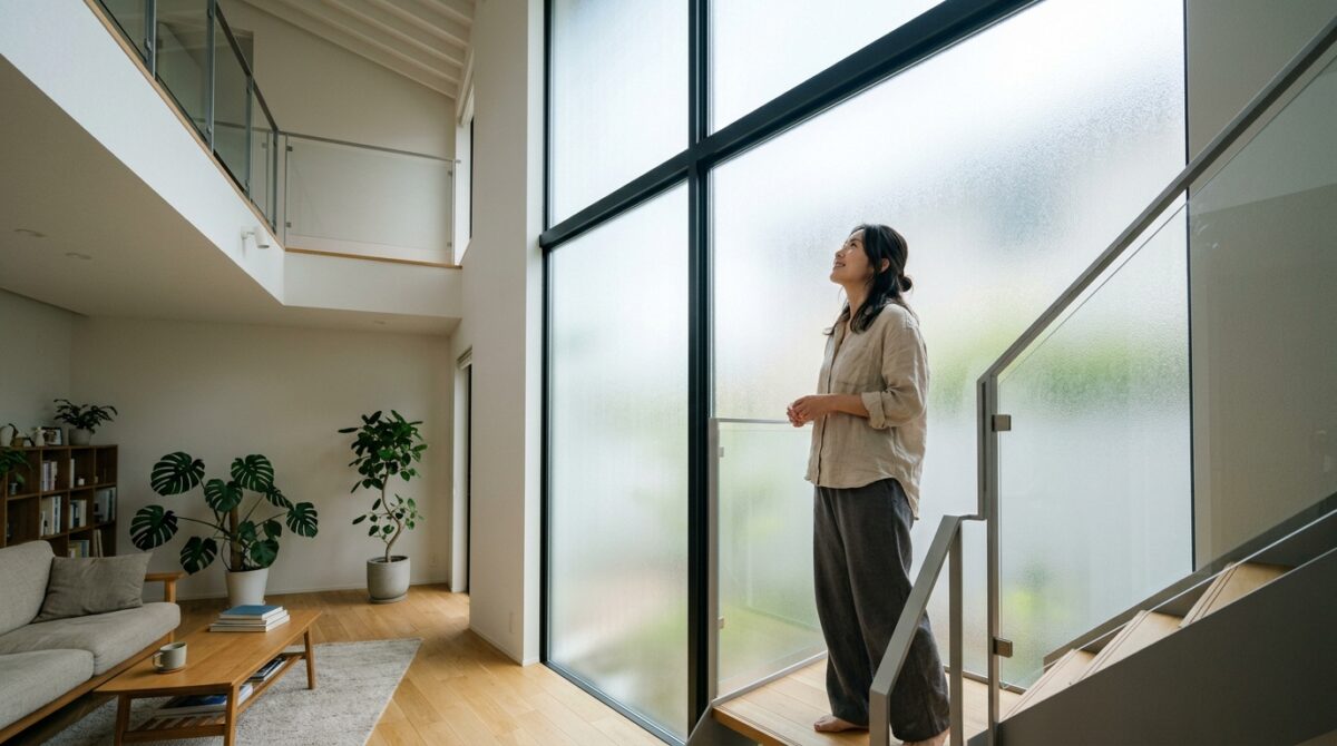 吹き抜けの高い場所にある窓にカーテンやロールスクリーンを設置すると、どうしても紐が垂れ下がったり、電動にするためのコストがかさんだりします。しかし、すりガラスであれば、最初から目隠し機能が備わっているため、これらを設置せずに「カーテンレス」な生活を送ることも夢ではありません。窓周りがスッキリすることで、空間がより広く感じられるという副次的効果も期待できますね。